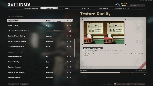 Black Ops Cold War‘s graphics settings are divided into four categories: details and textures, shadow and lighting, ray tracing, and post-processing effects. The common options such as texture quality, shadow quality, and effect quality are all covered. Ray tracing is divided into sun shadows, local shadows, and ambient occlusion, letting you specify how you want it to look. As a general rule, ray tracing on low or medium doesn’t do all that much so unless your system can manage either high or ultra, it’s probably not worth the steep performance hit. Even then, ray tracing is a better option for a single-player playthrough than competitive multiplayer.