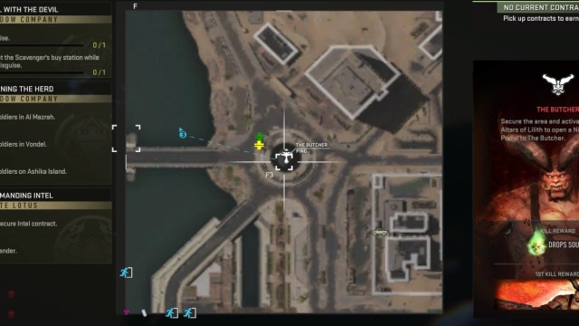 I managed to summon the Butcher in DMZ with randoms, so don’t despair if you’re a solo player. Head to Al Mazrah and try to direct your team to the mission icon. Each boss has a specific Icon, and you can check what you’re heading toward by hovering over it on your map. The Butcher Icon is pictured above.