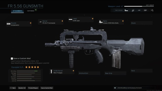 When kitting your FR 5.56, do not make the mistake many others often do. This is not a good long-range weapon. Just because you’ve thrown on a sniper barrel and a huge scope doesn’t mean you’ll be counter-sniping effectively anytime soon. Its burst recoil makes hitting long-ranged shots very difficult, and its falloff range means it struggles in single fire against any other sniper, DMR, or assault rifle built for distance. Improve its handling, put on a nice optic, and focus on landing that entire burst instead.