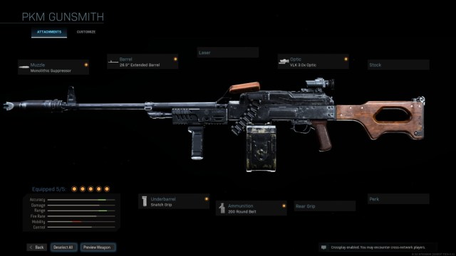 The fifth and final attachment can be tweaked dependent on playstyle. Given that this PKM build is best for suppression, the 200 Round Belt is probably the best choice for Warzone. However, the Tac Laser is a good option too as it greatly improves aim down sight speed. Some players use the No Stock attachment for similar reasons but the recoil control penalty provided by it is far from ideal.