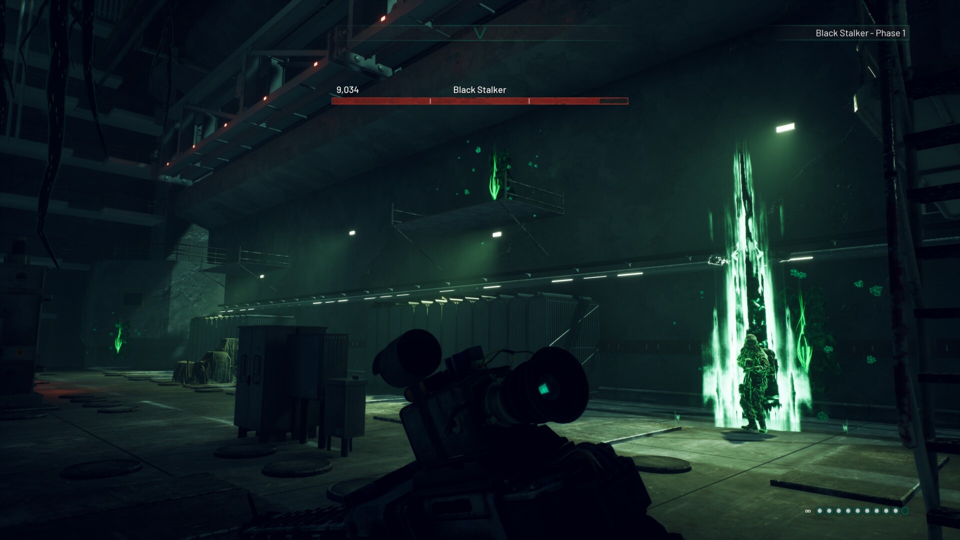 But, the time for talk is over. The Black Stalker/Igor challenges you and the battle begins. The Black Stalker will be on the right-hand side of the lab. You’ll see three portals here where he’ll pop up periodically. Whenever he reappears, he’ll fire his weapon (which can deal a load of damage while also irradiating you).
