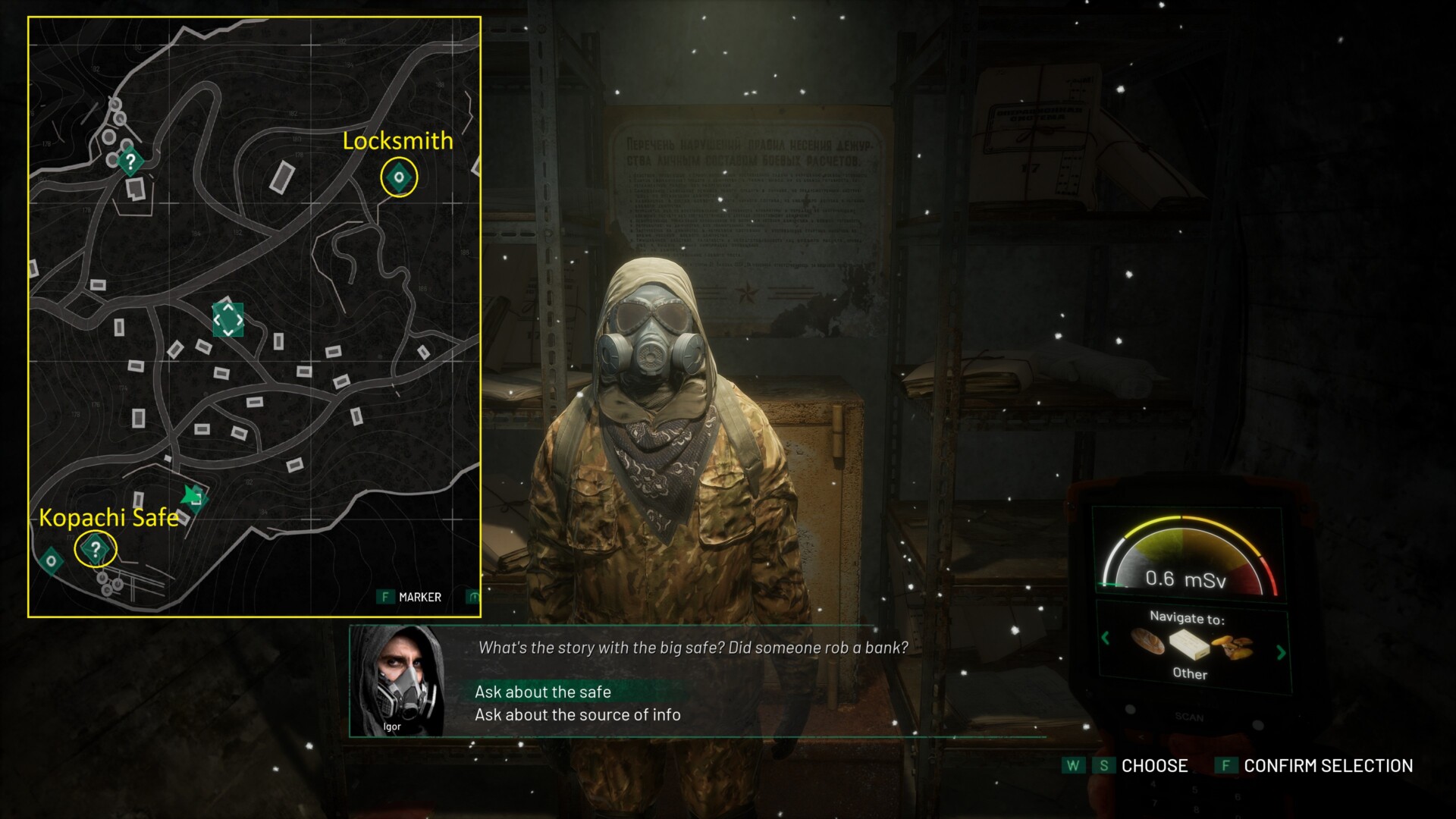 However, there’s one locked object in particular that might pique your curiosity. It’s the safe found in Kopachi (seen in the next image). The sewer and bunker entrances here would lead you to the safe down below. There, you’ll meet a scavenger who’s trying to open the safe to no avail.