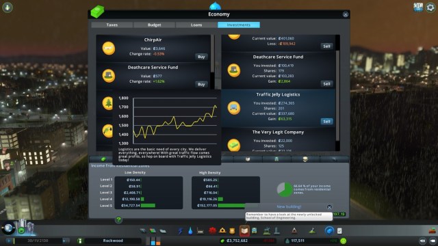 Once your building is placed, it unlocks a new section of the Economy menu: the Investments tab. The health of your investments are linked to the overall financial health of your entire city. So, a well-functioning city with a variety of different revenue streams will grant you the ability to play with a healthier set of stocks.