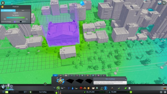 Under the ‘Unique Buildings’ tab, you’ll find the new Stock Exchange building. The first goal is to place it in an area that has a healthy concentration of either low- or high-density commercial buildings. You can only place one Stock Exchange building on your map, after all.