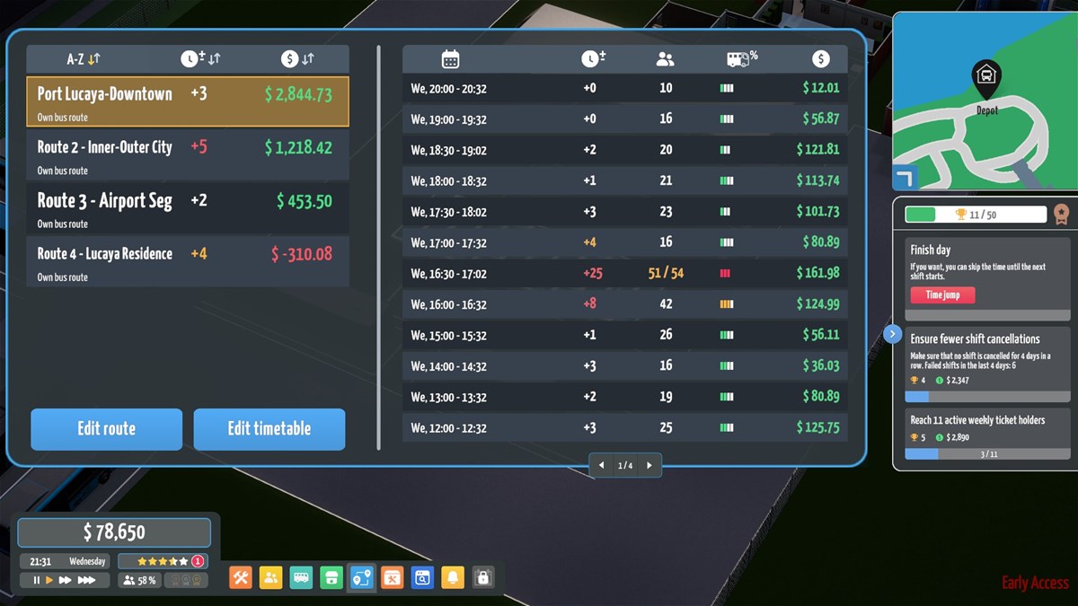 While not every route will make the same numbers, again, there’s still no indication as to why Route 1 performs far better than, say, Route 4. Some other sims that either focus on or even just merely feature such aspects of transport system building, such as titles like Bus Simulator 21 and Cities: Skylines, are great examples of having systems that effectively communicate to the player the likelihood that the new route they’re building will either succeed or not.