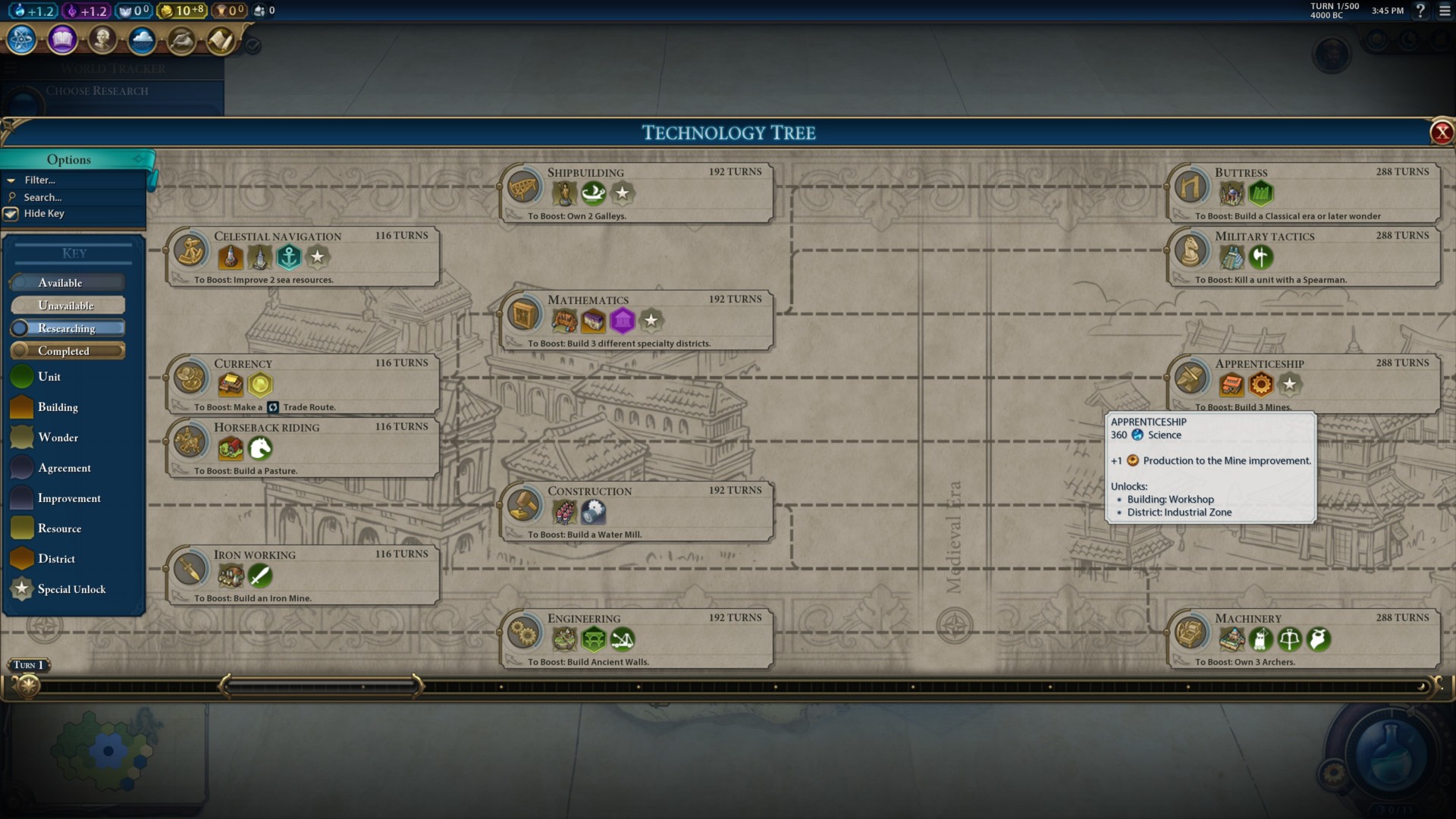 - Apprenticeship – Build three mines to get the eureka/unlock, and get your Industrial Zone up and running early in the game.