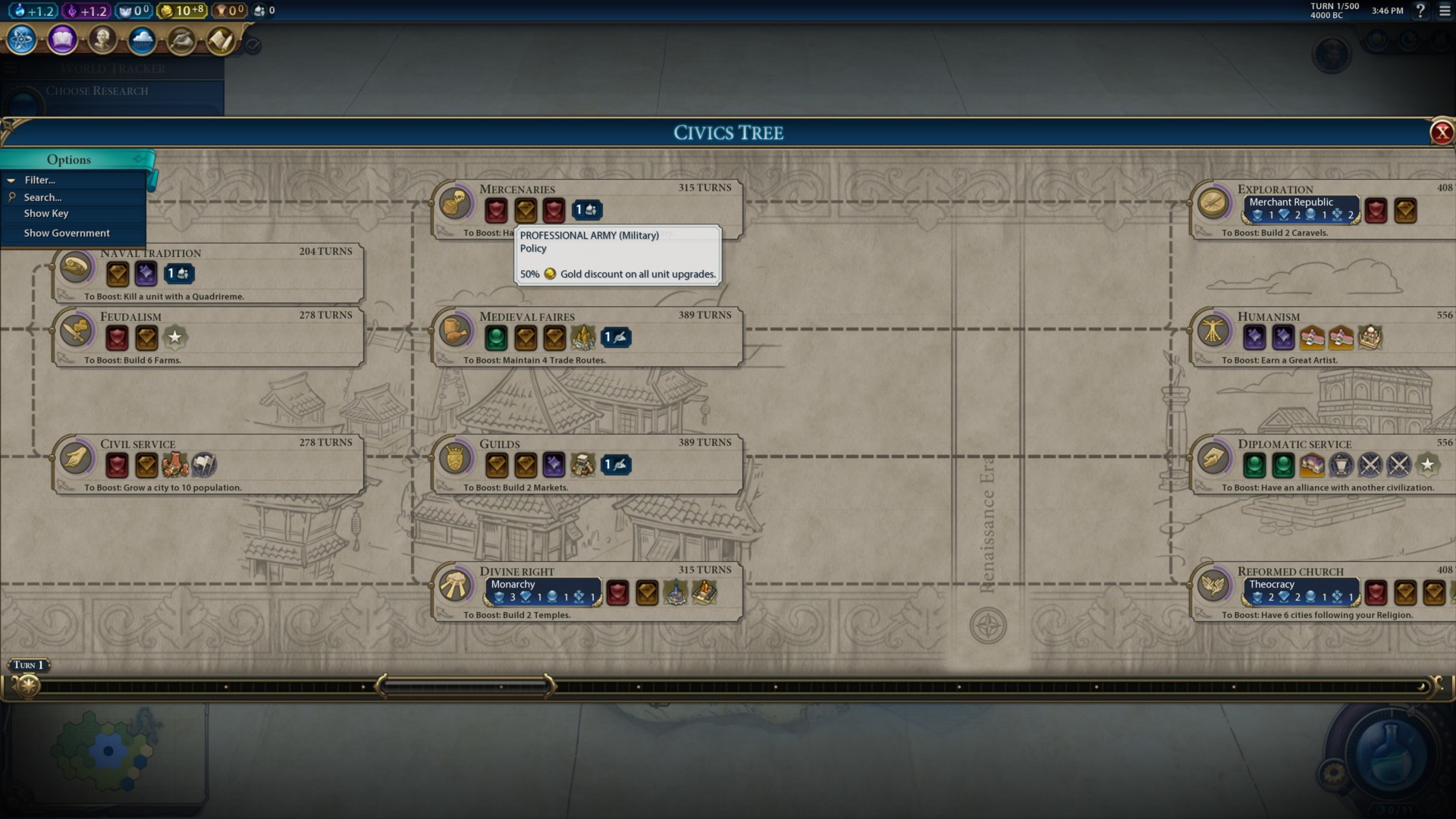This is where you might lag behind. While eurekas offer you boosts, discoveries do not. As such, you’ll have to obtain civics normally. Anyway, here are some tips: