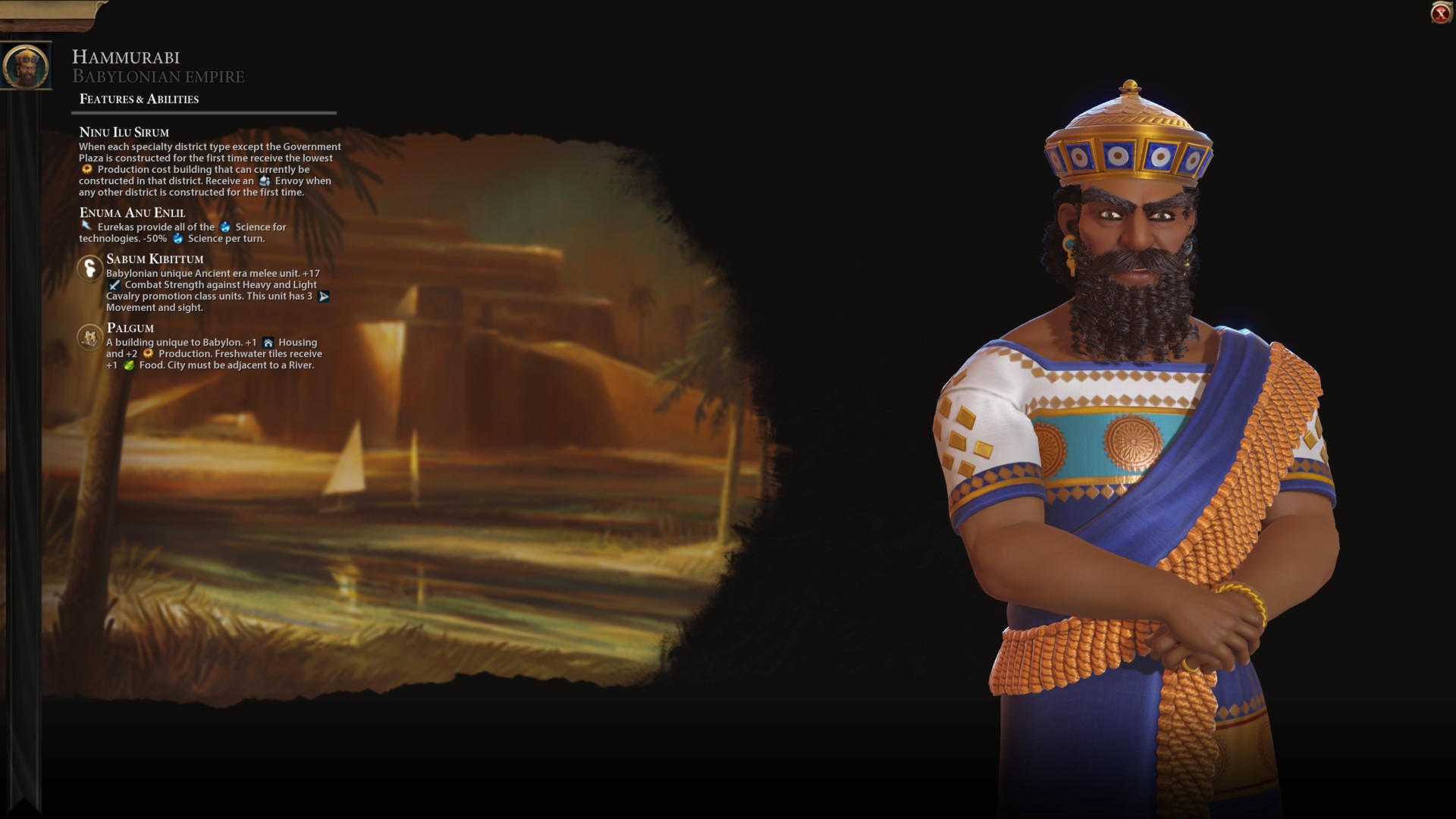 - Hammurabi’s unique leader ability: Ninu Ilu Sirum – Whenever you build a specialty district for the first time (except for Government Plazas), automatically construct the building with the lowest production cost and gain a free envoy.