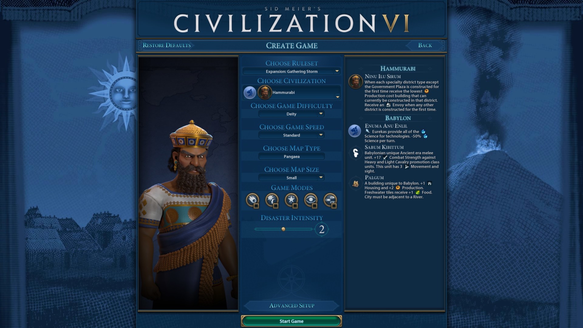 Below, you can see the settings I’ve chosen for my deity runs as Hammurabi/Babylon in Civilization VI: New Frontier Pass. Please take note that I’ve disabled all special game types, including “Heroes & Legends mode” to somewhat preserve the “vanilla” feel.