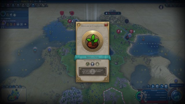 Primarily used to unlock access to a range of luxury resources, including Citrus, Cocoa, Coffee, Olives, and Incense, among others, Irrigation is a great way of boosting your Gold and morale in the early game. It also lets you clear Marshes, which is a great way of removing problematic land to make way for better districts and improvements.