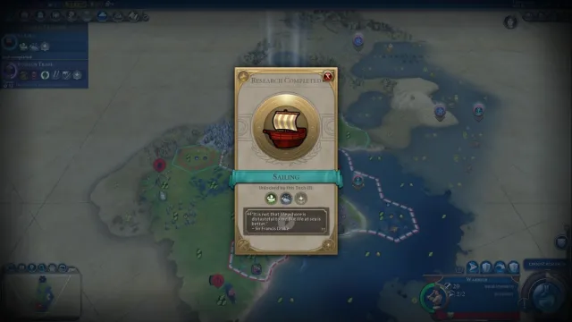 A specialist tech with fairly obvious uses, Sailing is a great choice when you’re playing as a naval-focused Leader, or even if you’ve just settled your capital city on the coast. Doing so will provide a nice Science boost to the tech, allowing you to research it faster, at which point you’ll be able to construct rudimentary Galleys and set up Fishing Boat improvements.