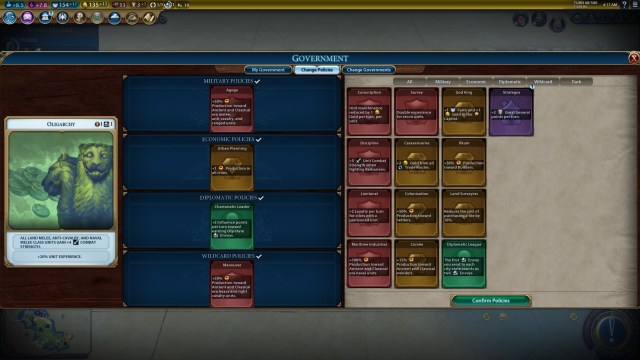 Below, you’ll see the policies I had after picking the Oligarchy government type. These are to help me churn out an army towards the end of the Classical Era and at the beginning of the Medieval Era.