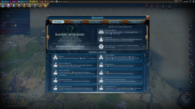Entering a Dark Age actually helped me because of the Exodus of the Evangelists dedication and the Monasticism policy. For the latter, I had already finished obtaining the Divine Right civic, so there’s no “mandatory beeline” anymore. Even if the Monasticism policy lowered Byzantium’s culture generation, the science increase helped immensely. Plus, the Cross-Cultural Dialogue belief guaranteed that I was getting lots of science from the population of converted cities.