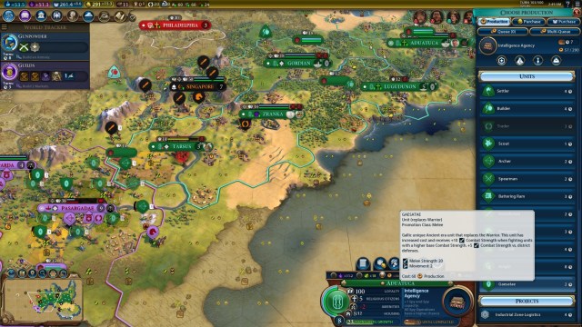 Honestly, it’s just Gaul’s Hallstatt Culture ability that holds the civ back by a bit. It throws off your district planning since many specialty districts (and wonders) rely on terrain, and you’re mostly trying to plop down mines just to maximize all possible adjacency bonuses and culture. Nevertheless, the extra culture from training loads of military units does help when nudging civic discovery in small increments.