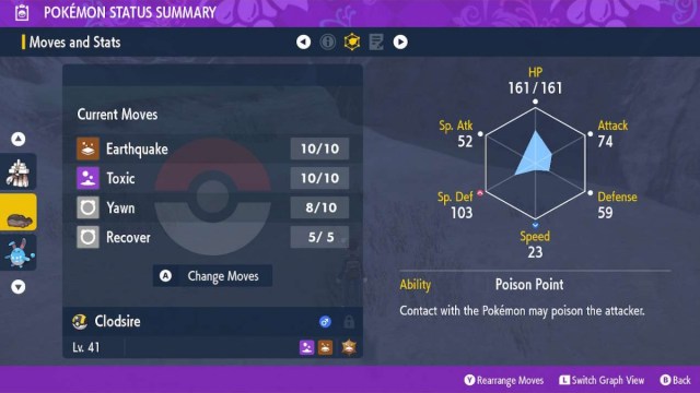 One of Quagsire’s weaknesses is that its defense stats aren’t high enough to be an effective defensive Pokémon but that isn’t true of Scarlet and Violet‘s Clodsire. Clodsire has a huge 130 Base HP alongside an impressive 100 base Special Defense. This combo alongside its decent defensive typing giving it five resisted types and immunity to Electric makes Clodsire difficult to overcome.