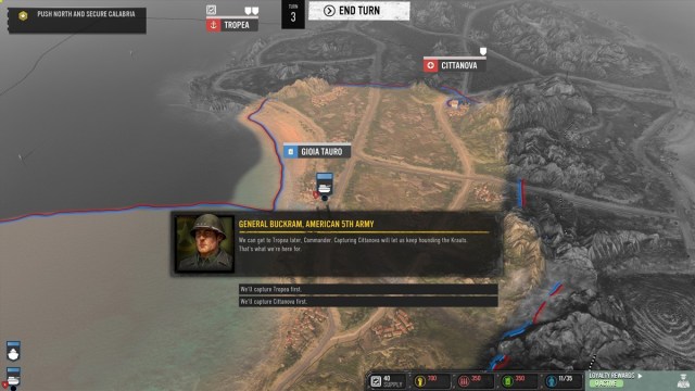 Earning Loyalty rewards in Company of Heroes 3 is fairly straightforward. Early on during the Italy Dynamic Campaign, you’ll notice that the two leaders, General Buckram and General Norton, seem to be at odds on how to conduct the landings. You’re then asked which target is to be prioritized, and you’ll make a choice. A bit later, you’ll meet Eleonora Valenti, the leader of the Italian Resistance in the region. If you aid her beleaguered compatriots, you’ll unlock Partisan Hubs/Partisan Actions.