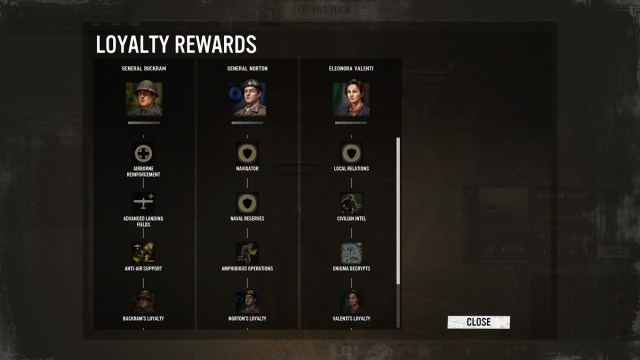 | 3 | Anti-Air Support – Adds a free AA emplacement at airfields when captured. | Amphibious Operations – Decreases the cost of the Transport Company ability at seaports. | Enigma Decrypts – Reveals enemy company, airfield, and naval actions. |