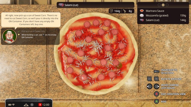 You’ll collect most ingredients themselves from the pizzeria’s cellar. There, you’ll grab a basket load it up with everything you need, whether it be tomatoes, garlic, onions, cans of corn, or olives. As you play Cooking Simulator – Pizza, you’ll unlock even more ingredients to add to your pizzas. There’s a fair amount of prep work involved, as you have to do everything manually which is just as you’d expect. You then place cuttable ingredients, such as salami, into an automatic cutter which will put slices into yet another GN tray. You’ll want all of this set up before you start accepting orders.