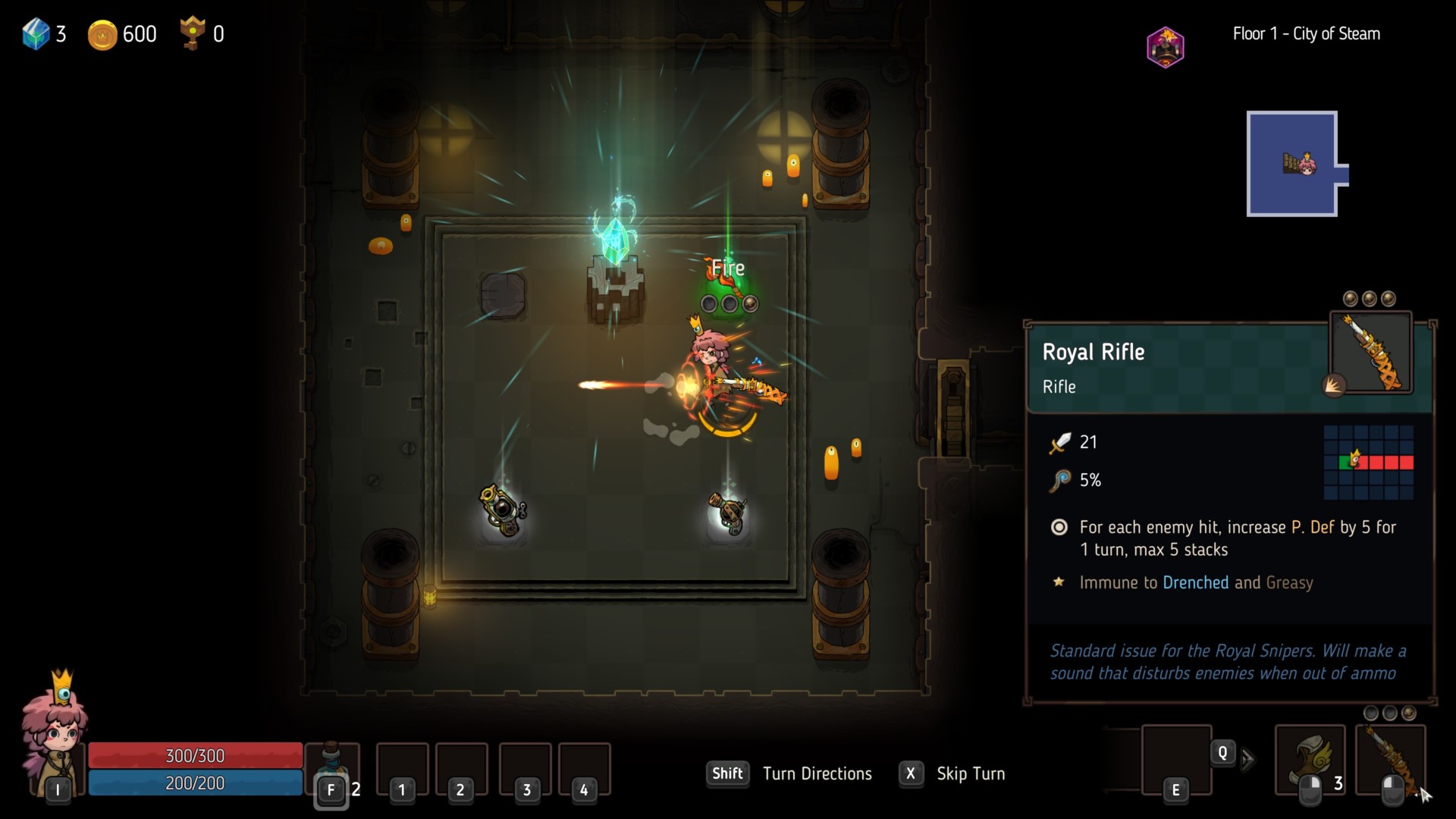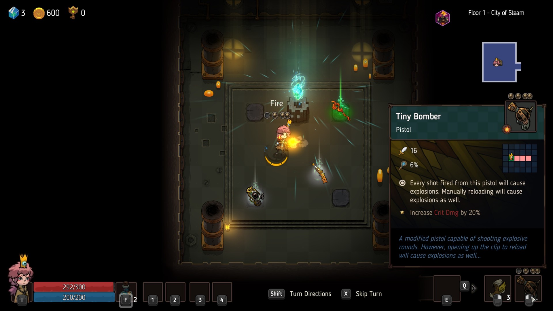 Pistols have more range than staves (three tiles). These weapons have four bullets — the first two are fired separately, and the last two are fired simultaneously.