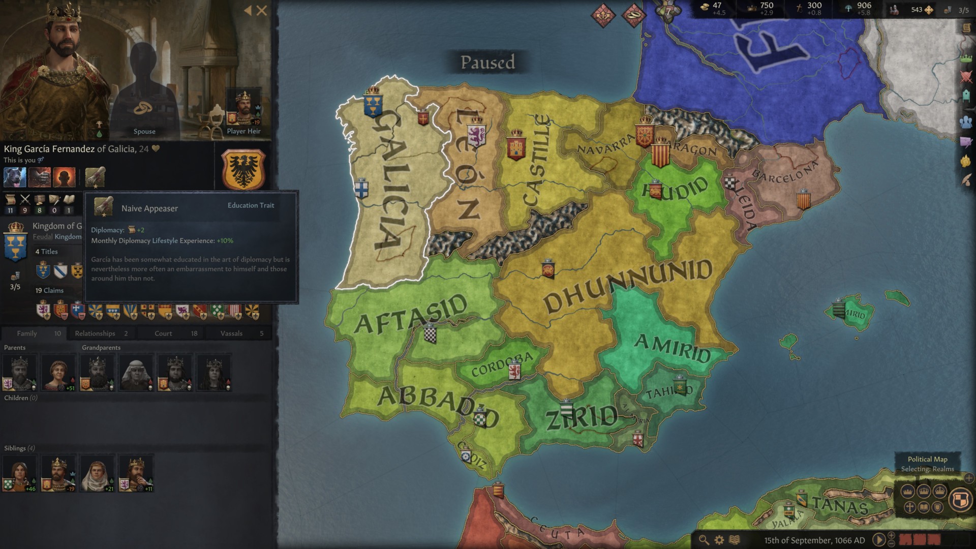 Philippe is still a teenager in the 1066 AD start date, but he has the “Curious” trait obtained when he was still a kid. This gives a bonus to education with a focus on Diplomacy or Learning. However, this nerd’s bookish attitude means he wouldn’t do well with a Martial-focused education (you’ll want the “Rowdy” trait for that).