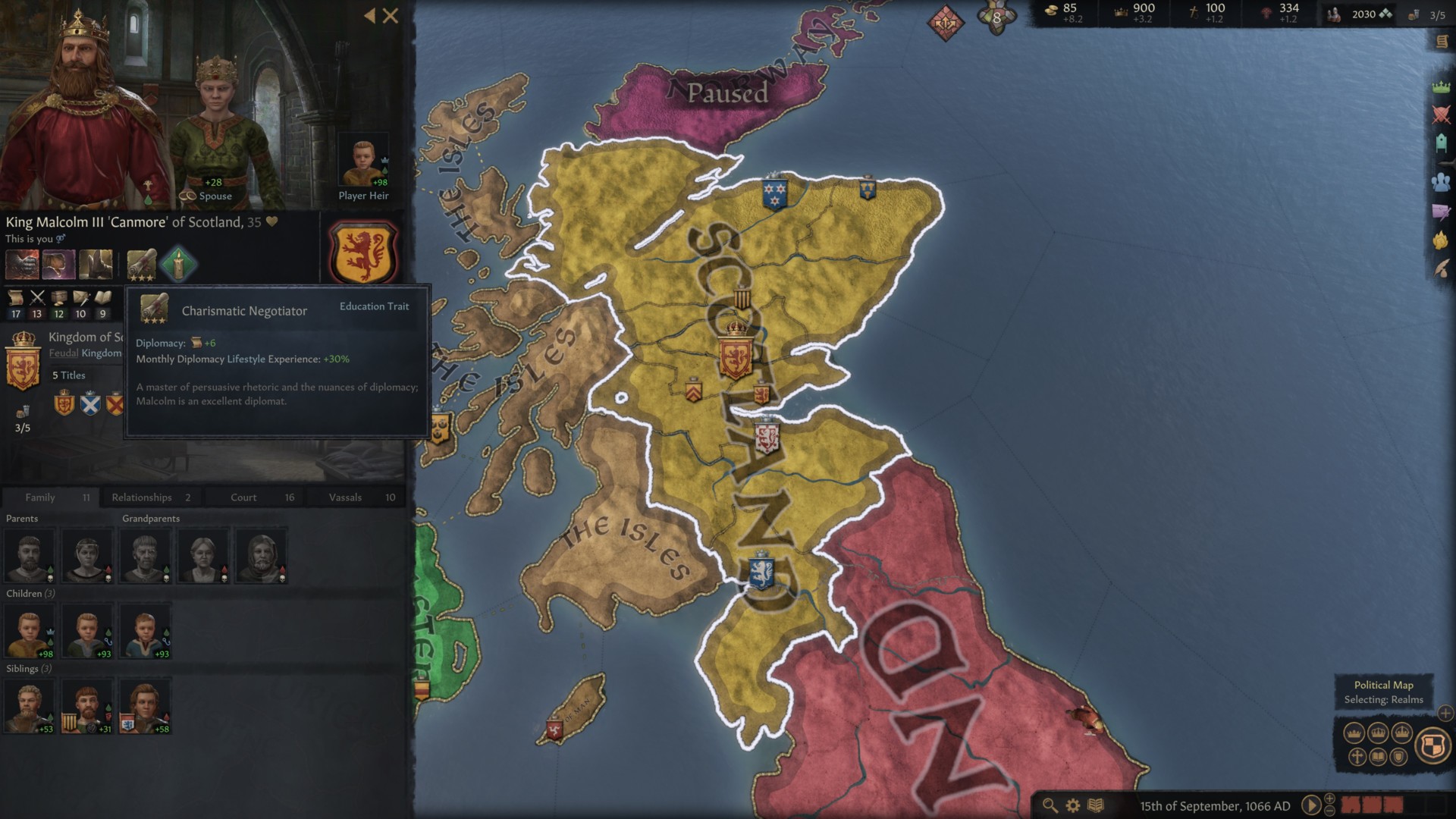 If you compare him to King Malcolm III of Scotland, you’ll see that the Scottish king has “Charismatic Negotiator” (level 3):