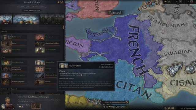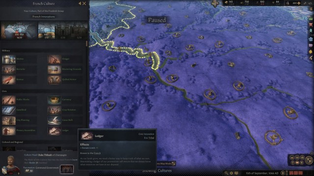 If you take a look at the culture panel at the bottom-left of Crusader Kings III‘s HUD, you’ll realize that it also doubles as the technology panel. This is where you unlock new tech by being “fascinated” with developments. It can take many years, and only the culture head (the ruler with the most number of counties of a certain culture in their realm) can do this. It’s actually funny because Philippe should be the culture head for the French, but Crusader Kings III can be iffy at times.