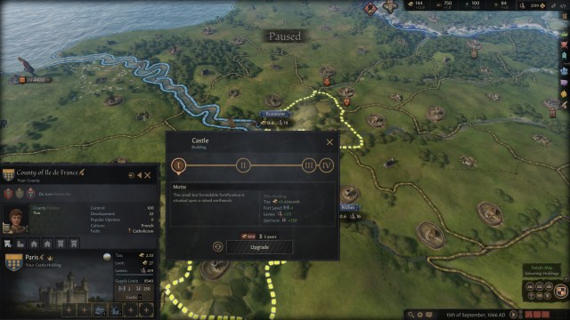 Let’s take a look at Paris in the county of Ile de France. You’ll notice several building slots that are available for construction. The main building, however, is the castle (since Paris is a barony-type holding controlled by nobles). Others such as cities and temples are controlled by mayors or priests respectively.