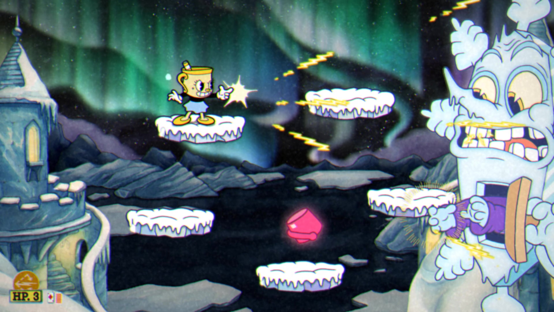 - Stay near the top platforms to more easily dodge the buckets, but watch out for the pink ones — you can parry these. When the buckets hit the other side of the screen, they burst into three moons that fly in a crescent pattern to the other side. Staying near the snowflake when this happens should give you enough room to dodge.