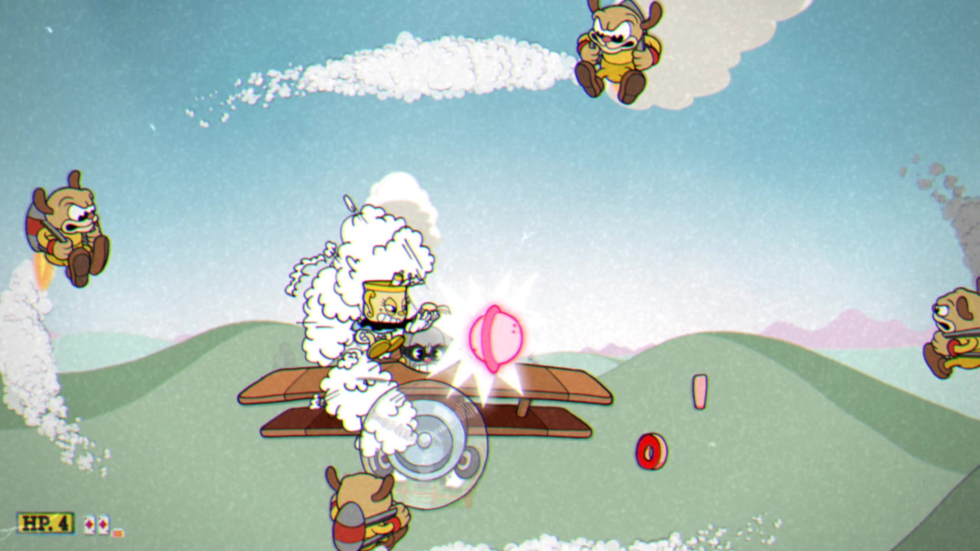 In the second phase, you face four small dogs using jetpacks. They circle around you in the air, firing off letters that spell “BOW WOW.” Dodge the letters, and hit the pink ones for a parry.
