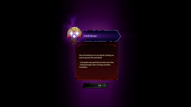 - Dark Fervor – Corruption passively increases over time, but going through a door no longer adds corruption to your meter.