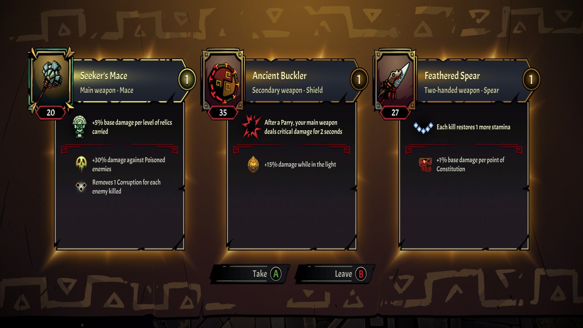 - If you stumble upon an altar and you don’t have the gold for a weapon or relic, you can pay a “blood offering.” This increases your corruption’s value based on the indicated amount.