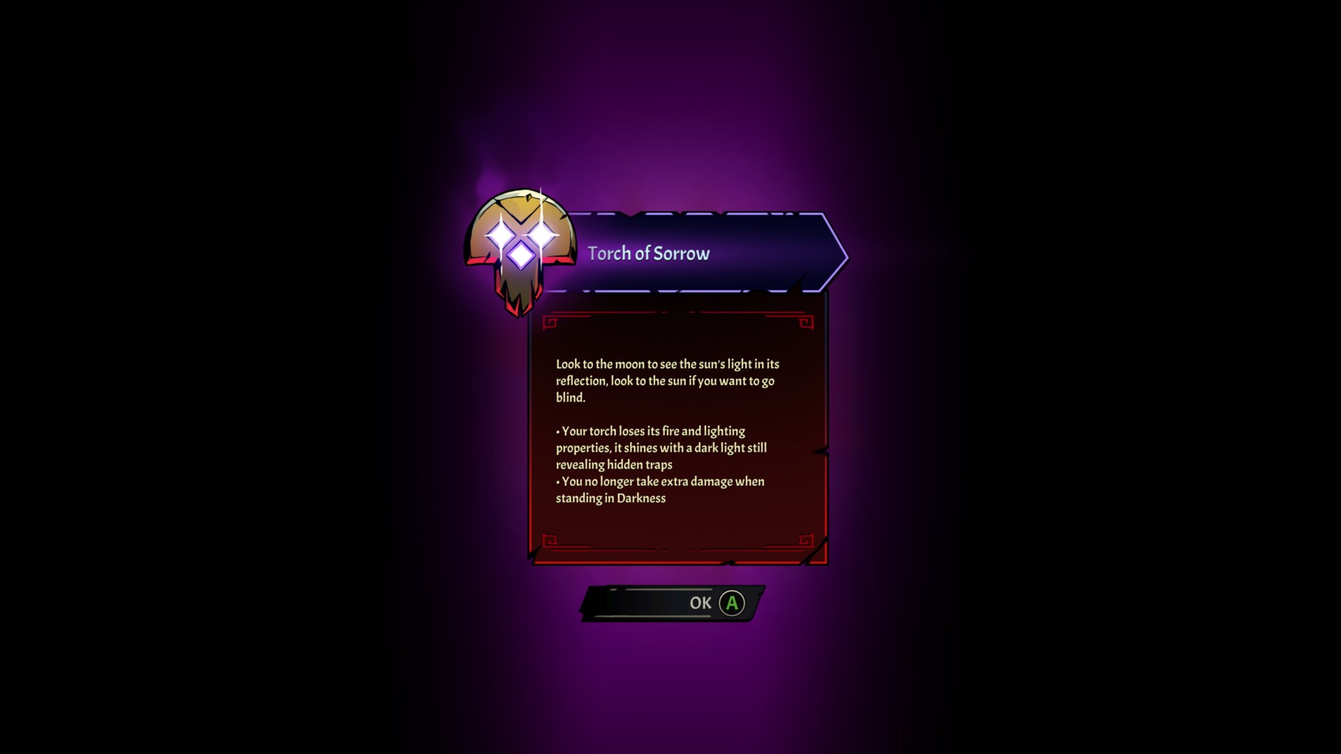 - Torch of Sorrow – Your torch can still reveal traps, but it can no longer light braziers. You don’t take increased damage while standing in darkness.