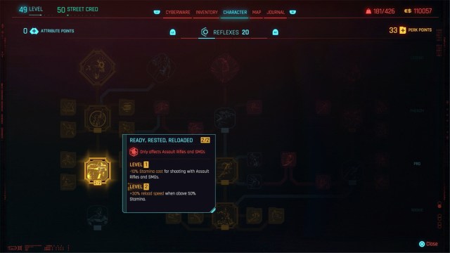 For perks, we need to look at the Reflexes skill tree. On the left side of this skill tree is where we’ll find the perks for Assault Rifles in Cyberpunk 2077. And if you take a quick peek at them, you’ll notice they mostly just make these weapons easier to handle. For starters, you’ll want to max out Ready, Rested, Reloaded. This perk reduces stamina cost for firing Assault Rifles, and at level 2 boosts reload speed when you have more than 50% stamina. You’ll then want to get each perk located around this node. But get Tunnel Vision first as it gives you a 20% boost to range and accuracy.