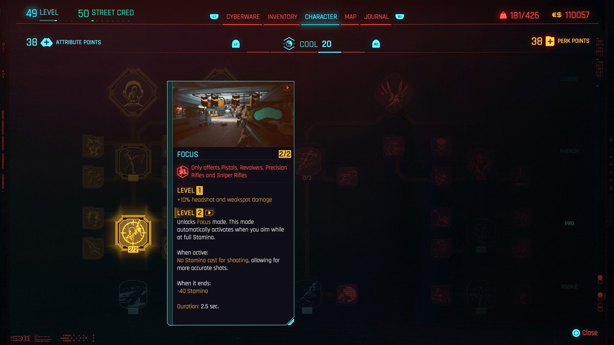 At the top of the tree, you get to invest points into two skills. Nerves of Tungsten-Steel is geared towards Revolvers, Precision Rifles, and Sniper Rifles and guarantees critical hits for headshots. Then there’s Run ‘N’ Gun, which lets you shoot pistols from the hip without consuming stamina. Plus, when Focus is active, you gain +25% to your movement speed. You can get both of these Handgun perks if you want, and they’re both deadly additions to your arsenal in Cyberpunk 2077.