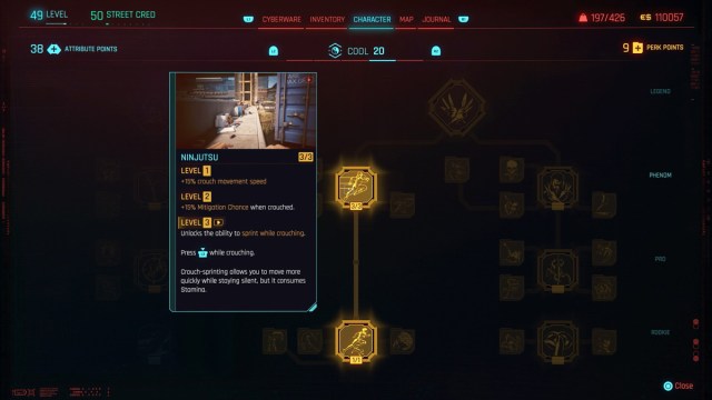 Head over to the Cool skill tree and take a look at the center branch of skills. On the bottom, you’ll see sills like Blind Spot which uses your Mitigation Chance when crouching to determine how long it takes for enemies to detect you. Grab all of the skills down here because they’re all very useful. Then look up to the next core skill to see Ninjistu. At the third level of Ninjitsu, you get a new ability that lets you sprint while crouching. And this is incredibly useful to dart past enemies whenever an opening appears.