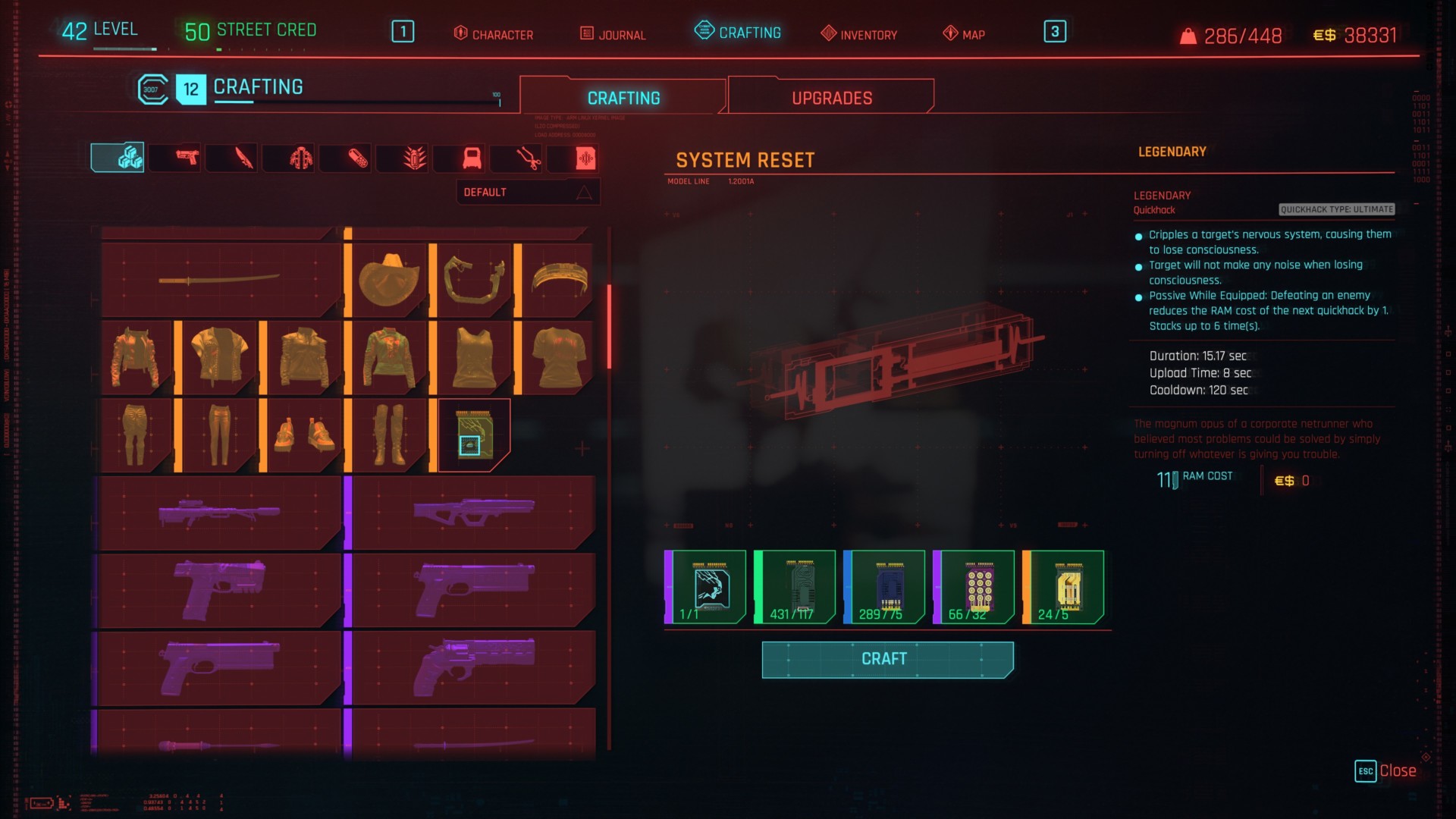 Since I picked “Datamine: Crafting Specs,” that unlocked the legendary “System Reset” quickhack as a crafting option.