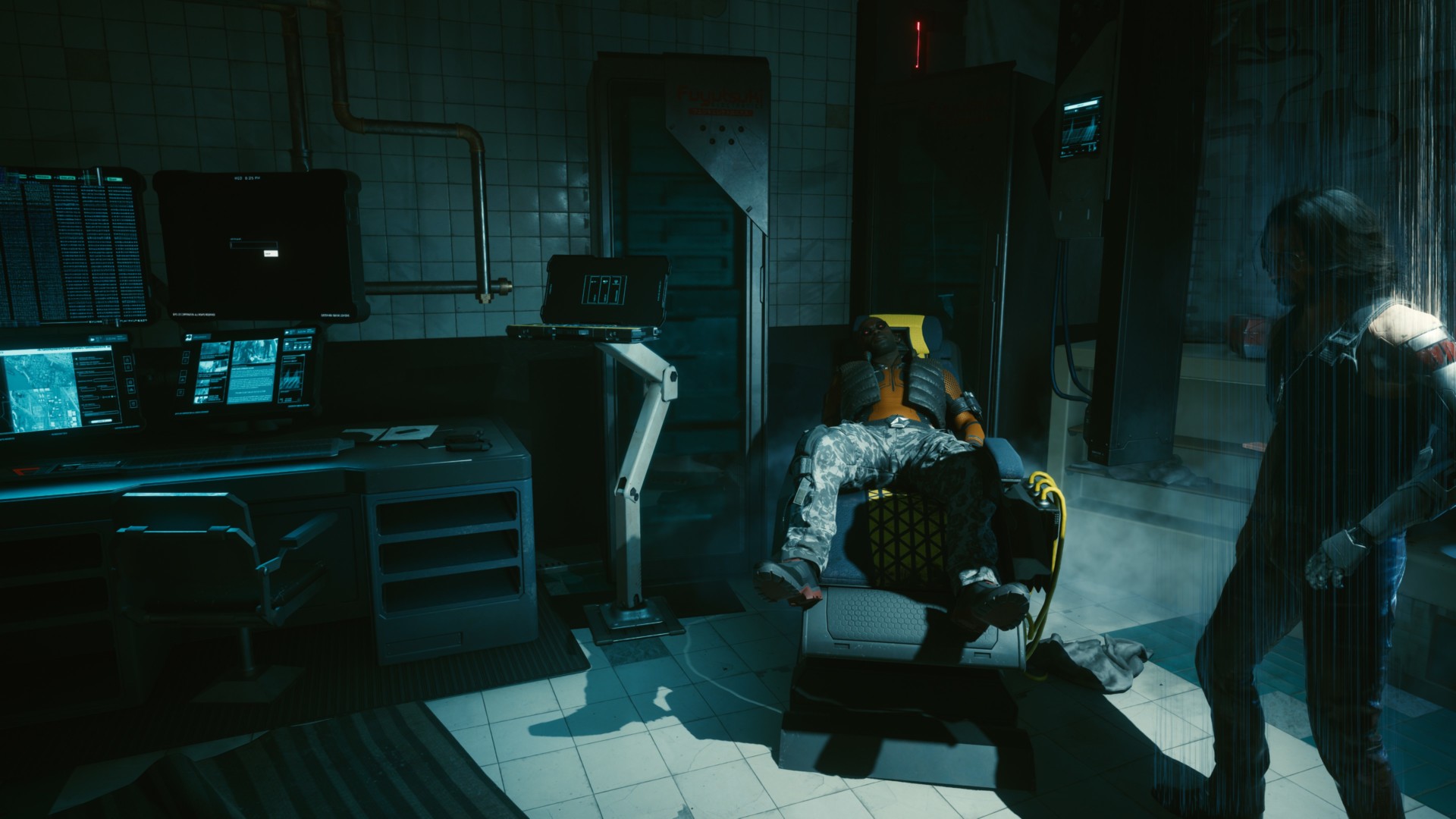 There’s a freezer nearby and, once you open it, you’ll find the corpse of Rache Bartmoss, the infamous hacker who crashed the Net. Johnny will chime in to tell you to bring Bartmoss’ cyberdeck to Nix.