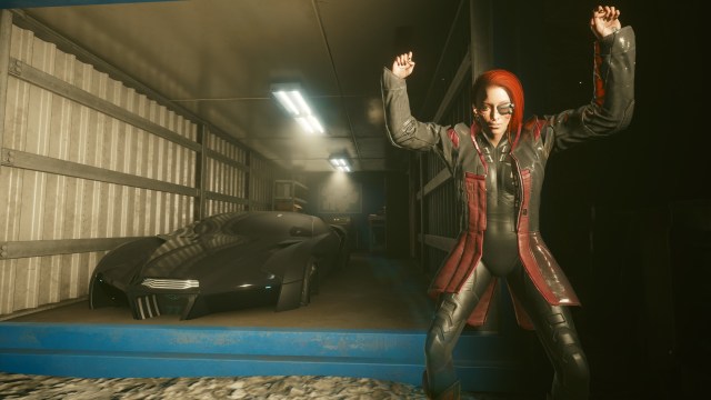 You’ll notice a car icon here and, inside a shipping container, you’ll find the Rayfield Caliburn. Once you enter it, it’ll get saved to your collection. Simply hold “V” to call it to your location.