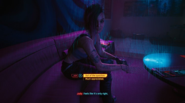 After several days, Judy will ask you to go diving with her. This is a cute moment for her and V, and it’s also one of the coolest moments in Cyberpunk 2077. Once the two have surfaced, choose to spend the night with her. If you don’t, that ends the romance.