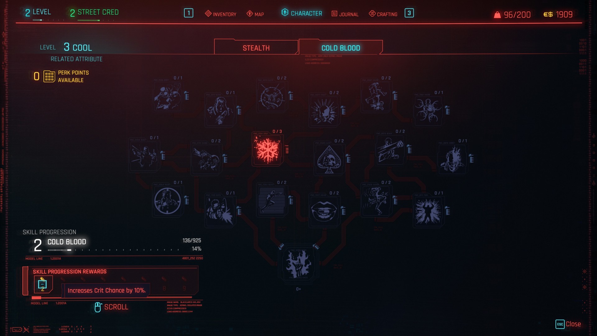 | Cool – Stealth and other quirks | Stealth – Killing or attacking enemies without being detected (this includes those affected by Quickhacking skills) Cold Blood – Getting more kills while the effect is active, as well as critical hits or executions (i.e., equipping a sword, holding the attack button, and chopping off an enemy’s head) | +2% crit damage; +1% resistance vs. all damage types; +10% stealth damage; +3 Monowire damage; +0.5% enemy detection speed when you’re stealthed |