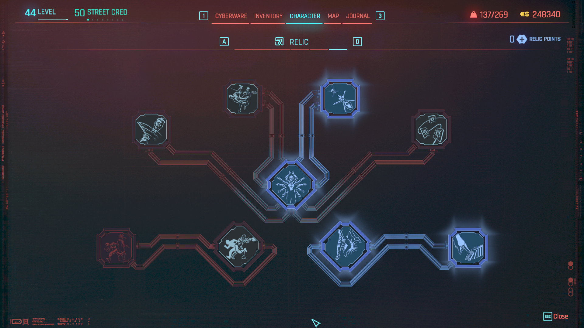One of the first skills you will purchase in the Relic Tree will be the ability to upgrade your arms’ cyberware. The single Relic skill affects each of the different arm skills separately. It will cost a huge 3 points but then branches off into more specified skills.