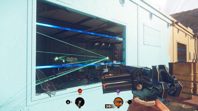 - Check windows of the main building (Serling Labs) and use your Hackamajig to commandeer the turrets.