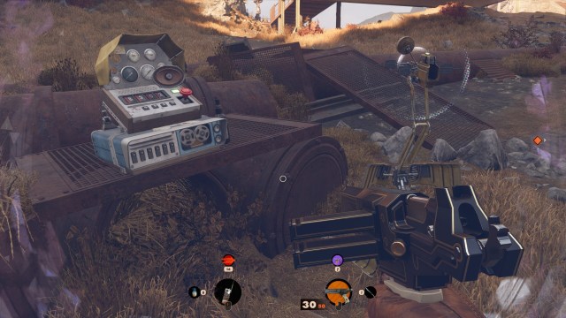 - Bring it outside to the central area where a purple object is shimmering. Deploy it.