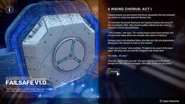 Steps 14 and 15 take place and are completed at the same time in the H.E.L.M. Interact with Failsafe to deliver the new data and then Ikora will appear and give you some insight about what transpired after the Witness was killed and how it has influenced what happened in Nessus. Then, Failsafe will reward you with the Veiled Threat auto rifle, concluding A Rising Chorus Act 1 Part 2.