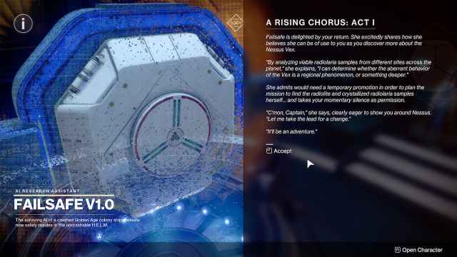 Week 3 – Steps 16 & 17: Failsafe is analyzing the data and receive a mission briefing in Destiny 2