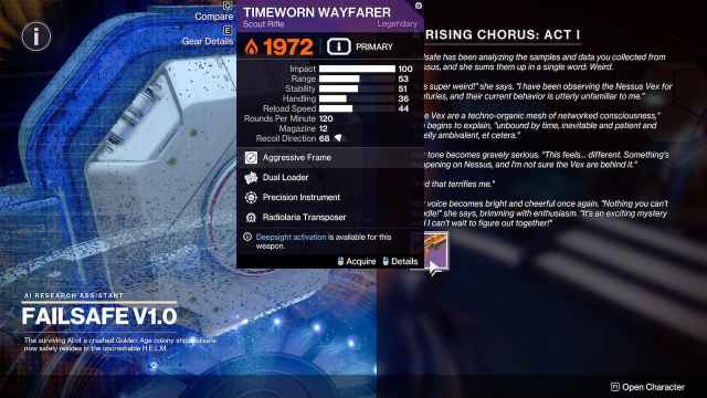The only thing you need to do is to report to Failsafe by interacting with her and she will note that the identity behind the Vex’s strange behavior is a mystery that we will probably want to research more. The specimen we collected will be named NES001 and will open up a new quest and feature in the H.E.L.M.: the Radiolife Research Bay. She will also reward you with a Timeworm Wayfarer scout rifle and then leave you to be.