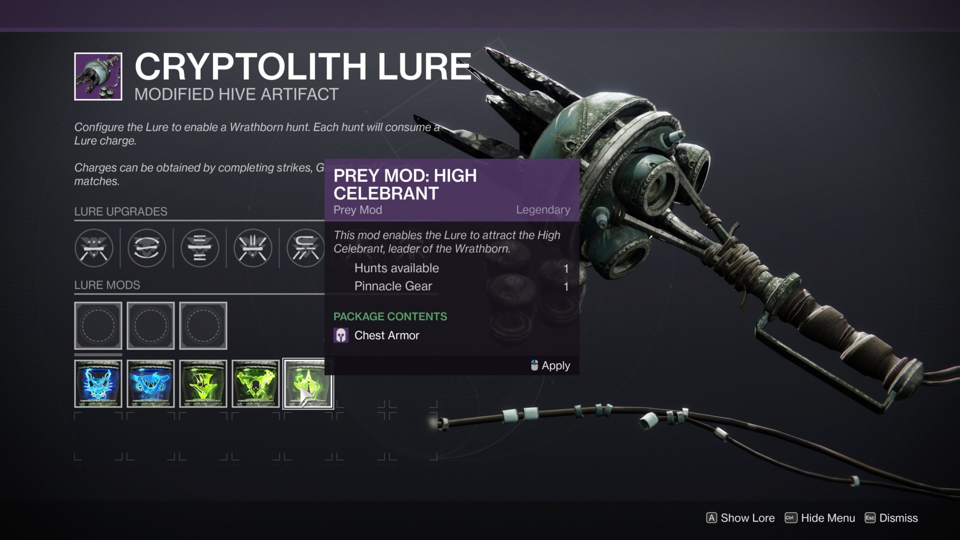 Open your Cryptolith Lure and slot it in. You’ll notice that this Wrathborn Hunt awards pinnacle gear and that you can also add the “High Stats” armor trophy mod.
