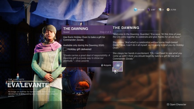 The first thing you need to do if you want to partake in Destiny 2‘s Dawning 2020 event is to visit the Tower. There, you’ll find everyone’s favorite digital grandma, Eva Levante. She’ll give you a quest and Eva’s Holiday Oven 2.0.