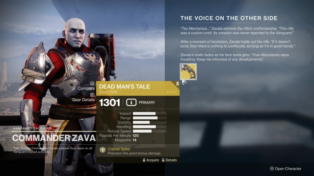 Travel to the Tower and talk to Zavala to obtain the Dead Man’s Tale exotic scout rifle.