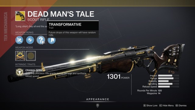 I’ve tried the Dead Man’s Tale in PvE and I’m really enjoying it. Think of it as something akin to Hawkmoon: a weapon that requires you to land multiple precision hits to make the most out of its perks. With five stacks of Cranial Spike, your damage becomes deadlier, and you can keep blasting the weak spots of your foes with it. I’ve yet to test it in a raid, though, but I’m hoping that it’s good for boss DPS. Likewise, the Transformative perk means you’ll get a different roll in the future in case you try to grab the weapon again.